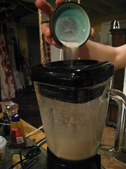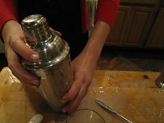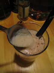 I decided I needed some help in concocting this sister to the classic drink, so I enlisted some friends. Food expert Mark and pedigreed cocktail whiz Nick stepped up to the challenge/let me raid their liquor collection and bartending tools. My first hypothesis: forget the eggs. Supplement the heavy cream with some milk steeped in vanilla bean and cinnamon sticks. Emulate the froth with a touch of sparkling water, and shake the whole thing up to just before it explodes. Grate some nutmeg on top. Have a party in a glass.