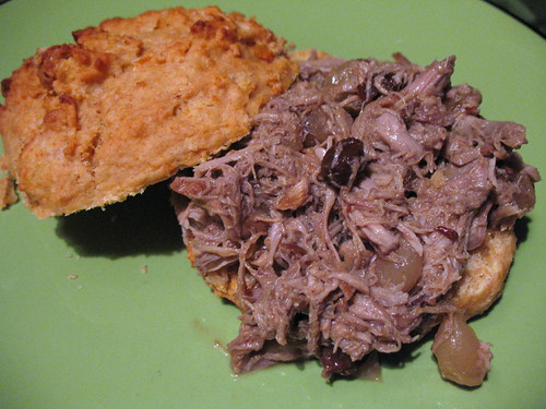 Let cool once removed from the oven enough to handle. Scoop out the duck legs and place in a colander set over the pot while you separate the bones and skin and toss out excess pieces of fat from the meat. Scoop out the raisins and onions; discard the sage leaves. Combine the raisins, onions and duck meat and set aside. Heat the pot of braising liquid on the stove over medium-high and reduce, stirring occasionally, until reduced to about one-half. Season with salt and pepper to taste. If it looks like you still have too much liquid to blend with the shredded meat mixture, reduce it more. Stir in the duck meat mixture thoroughly to re-warm. Serve with biscuits (optional).