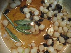 The duck’s dark leg meat is game for many flavors to enhance its natural funk. I went with a sweet, fruity twist by drowning it in apple cider and leaving it to braise a few hours. But first, I added pearl onions, raisins, garlic and sage to the same pot used for browning and deglazed it with some sweet sherry wine.