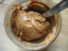 I’m a fan of natural peanut butter, which doesn’t have the emulsifying agents that keep the oils from naturally separating from the solids. This might sound like a problem, a layer of peanut oil on top when you open the jar. But once you stir it, and refrigerate it, they stay where they’re supposed to be — mixed in! I prefer natural simply because most brands that sell it tend to use less sugar than the brand names I grew up with (Skippy, Jiff and Peter Pan), and it seems to have a more prominent roasted peanut taste. I usually get Trader Joe’s natural peanut butter since it’s so cheap, but recently bought a jar of Smucker’s and am loving the rich flavor and slightly grainy texture of the creamy version. (Making peanut butter — now that might just be the next DIY quest!)