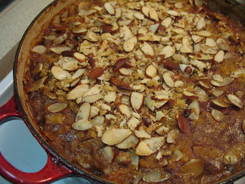 Combine the breadcrumbs, almonds, and reserved thyme leaves (removing any bits of stem) in a bowl. Sprinkle on top of cassoulet. Bake, uncovered for 1 hour until breadcrumbs are lightly browned on top. Let cool for 15 minutes before serving.