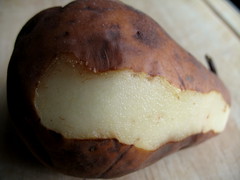 It’s unseasonably warm in New York today. I’d had a case of winter vegetable fatigue earlier this week; talking with my friend about eating squash, he gave me the hand and said, “I’m so sick of squash I can’t listen.” I, too, had become sick of what’s in season: cabbage, apples, carrots and parsnips… Instead, today I felt like nibbling a fresh, summer salad. But wait! It may not be leafy green season yet, but shredded cabbage makes a fine, crunchy salad base. And despite the limited options at the Greenmarket, I’d picked up a bag of twelve slightly bruised apples and pears. I was delighted to find a mix of apples and pears (this was from Locust Grove Farms, at the Union Square Greenmarket, the bag only $2) and have been crunching on them as snacks throughout the week. Those pears were a steal; though their skins looked dull and browned, a quick shave revealed crisp, snow-white, juicy flesh. So a pear and cabbage salad was to be my salvation.