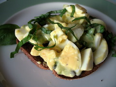 I’m definitely a fan of egg salad after this lunch. Not only is it cheap and healthy — you’ve got proteins, veggies and it goes great with whole grain toast — but it lends itself to endless variations. When bringing it to work for lunch, getting back to my initial conversation with Kate, it’s probably best to keep the egg salad in a separate container, and assemble it on bread just before eating so that it doesn’t get soggy. Lastly, to get the basil into those chiffonades, roll the leaves lengthwise into tubes, cut, and uncurl. It’s best to add this garnish at the last minute, too.