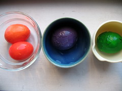 Onto the next step, dying the eggs, Easter-style. Well, almost. I wanted the peeled eggs to be colorful, since I’d be serving them deviled. Trusting the measurements on the side of my box of food coloring, I added plenty of drops of color to each half-cup of liquid in order to make what I thought would be pretty pastel purple, teal, orange and yellow-green. I guess they were thinking of shell-on eggs, only. Because my eggs were a shock of midnight violet, deep-sea green, neon superorange, and emerald city in about a half hour. I can’t say that wasn’t a fun lesson to learn as well. At least the dye didn’t penetrate the whites (sorry, first and second albumens) to stain the yolks, which would have been a deviled egg disaster.