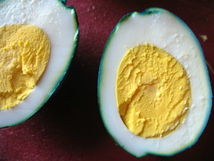 another egg-peeling tip that i always use, post-cold water bath, is gently cracking the shell all over, then rolling it between my hands until i can feel the membrane loosen. i believe i picked it up from The Joy of Cooking, and it works on even the freshest of eggs, straight from the farmer’s market. now if only i could perfect my timing, i wouldn’t blue the yolks 🙁