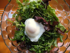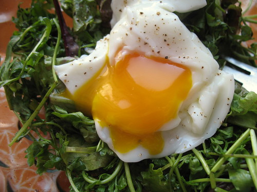 Three brownie points: It’s not much for a meal, but as a side salad, it has several virtues. The minimal douse of oil and vinegar takes into account the runny egg yolk that will coat the greens, too. It’s rich in flavor albeit cholesterol, but one egg has as much as six grams of protein. Plus, when poached there’s no other fats used to cook it, one of the reasons it’s my preferred method of the moment. Peppercress, if you can find this delightful green while it’s young and tender (try Union Square Greenmaret, or take a foraging tour with Wildman Steve Brill, as he calls it “poor man’s pepper“), is similar to watercress, and as such is rife with leafy-green nutrients like Vitamin K and detoxing benefits.