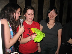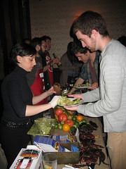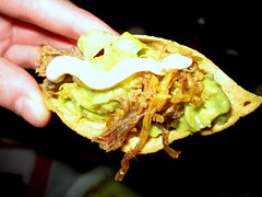 That, and I probably had more than my share of Tecate and Modelo Especial, a $2 special of the Cinco de Mayo-dated fete. I’m still feeling the repercussions. (And trust me, looking forward to the relative healthfulness of the Tofu Takedown this Sunday.) In any case, the event was hosted by the fine folks at Nachos NY, the site dedicated to the ebonic assertion of disownership and foodstuff otherwise known as tortilla chips. Commander-in-Chiefs Lee Frank and Rachel Anderson tapped New York City restaurants and home chefs alike to summon their ablest Aztec artistry. The result: ten contestants or teams of cooks, several gallons of free guac, and a line that wound around the once-spacious venue.