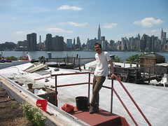 Last November, Ben Flanner read an article about Chris Goode in New York Magazine, and how he’d built several green rooftops in NYC, including his own in Soho. Then working in an office for eTrade, Flanner had been devouring books about farming all winter, and knew he’d wanted to do “something with it” that summer. The two mens’ dreams came together after Flanner contacted Goode about starting a rooftop gardening project. They eventually found an industrial warehouse on Eagle Street willing to host the rooftop farm. Owned by Broadway Stages, its cavernous interior is frequently rented by the film industry for movie sets. For a partner, Flanner was constantly referred to Annie Novak, a farmer with Kira Kenney of Evolutionary Organics.