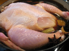 Rinse and pat chicken dry. Rub with salt throughout its surface and inside the cavity and refrigerate for 4 hours (or overnight). In a large saucepan (big enough to hold the chicken fully immersed), bring the water, soy sauce, star anise, cinnamon, peppercorns, scallion and ginger to a boil. Let simmer for 10 minutes. Add the chicken and cook another 15 minutes, turning once.