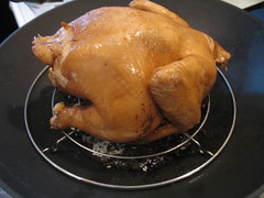Remove and let cool for a few minutes. In a large, heavy-bottomed pot with a lid (a Dutch oven will do), spread the tea, rice and sugar on the bottom. Heat over medium-high flame until the tea mixture becomes fragrant. Reduce heat to low, and and place a roasting rack that fits inside it on top, so that the surface is just elevated from the tea mixture. Place the chicken breast side-up on top, and cover with the lid. Cook over low heat for 20 minutes.