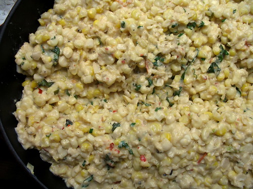 Meanwhile, cut the kernels from the fresh corn directly into a bowl (to prevent them from falling all over the counter), catching any juices. Run the back of your knife across the shorn cob to draw any more juices. Add the corn to the saucepan and stir another 2-3 minutes. Add 1/4 cup of the milk and cook, stirring, until absorbed. Repeat with another 1/4 cup of milk, and the next. Add the cream, and season with salt, pepper, red pepper. If mixture is still very thin, add one tablespoon of the cornmeal at a time until it has reached a desired pudding-like consistency. Add the lime juice, basil, olive oil and optional herbs and serve.
