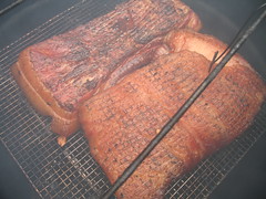 I had been in intense quandary as to what to do for my dish. A few things I knew for sure: I wanted to cure and smoke bacon, to cut into squares. To offset the fat, why not fold them in crisp lettuce wraps? There would have to be something to tie it all together, though. It seems like the newest offerings of the season at market stands are what attracts people most, like the “New in Hardcover” table at bookstores. When something’s just in, everyone suddenly remembers how much they love it. (Sour cherries? That was so two weeks ago.) This was just beginning to happen with corn on the cob. It’s usually later in the summer that we see it the most, but corn had been trickling in discreetly over the past week or so. It’s also a quintessential vegetable for grilling. So my bacon lettuce wraps would feature corn two ways, as shucked kernels of Taiwanese glazed, grilled corn, atop a small mound of savory corn pudding.