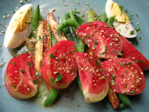 It’s too hot to think anyhow. Now, I’m not a raw foodist, and think most vegetables have a virtue for being uniquely edible raw, lightly cooked and stewed to death (i.e. collards). So I made a cold salad with a number of seasonal ingredients that were cooked — or not — to varying degrees. The heirloom tomatoes were by far the best part. Ripe and autumn leaf-pigmented, they’re so sweet and succulent raw, there’s certainly no cooking necessary. But if you do become bored with their flavor (and a lucky he or she who does, especially given this year’s devastating tomato blight), you can always sprinkle some interesting herbs or spices on them, like the Egyptian toasted nut and spice blend, dukkah.
