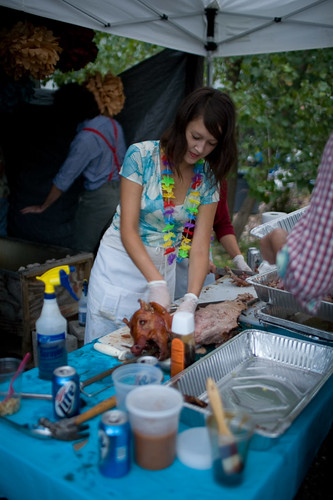 Cooking an entire animal such as a pig on a spit is a tradition as old as eating itself. In this country, it enjoyed — and still enjoys — a strong following in the South. But as Nicole Taylor mentioned on Heritage Radio Network’s The Q Report yesterday, it’s waned in popularity significantly. However, a not-so-insignificant pig roasting renaissance has been happening in New York City: there was one going on yesterday at Roberta’s Pizza, a few weeks ago, at Third Ward, a July 4th one at Queens County Farm Museum, a “Big Brooklyn Pig Roast” last fall at the Yard, and there have been so many others. Here and there, more progress is being made to put meat back into perspective, from the butchering classes given by Tom Mylan at The Brooklyn Kitchen, to more restaurants purchasing whole animals to divvy up into numerous dishes. I’m excited to see where else it goes.
