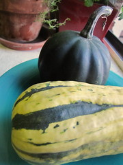 Six brownie points: Once again, it’s mostly squash, and these are just in season from the local farms. You’ll find many more choices of squash varieties at the Greenmarket or specialty farm stands than the grocery store, in my experience, and that’s a fun seasonal activity alone. The imported coconut milk and California lemon in this recipe are not quite on par with seasonality nor locality; at least the tomato was the last one from my CSA.