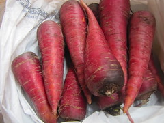 I’ll have to forgive these strange carrots for painting everything purple. They’re a rare breed, a small-farm find, and though their redness was only skin-deep (the insides are orange) they were tasty and sweet, a real seasonal treat. I may have to pickle some to preserve them next.