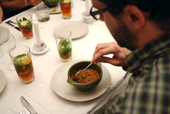 Which brings me to this squash and chorizo soup. One of the reasons I began writing this blog was so that I could simply remember, and share, all the great food I was making. In the process, many recipes got left to the wayside, many memorable nights of feasting, too irresistible to just savor in their moments rather than record. A good handful of these occasions took place about one year ago, when a friend and I set forth on a spree of inventive dinner parties with friends. The concept was simple: we’d each invite two of our respective friends, whom the other didn’t know. We chose ones we hoped would gel, and who loved to eat. We cooked, four courses each night, and for me, it was an especially fun challenge because my friend who was co-chair in this flight was vegetarian, so all the dishes were. We’d had a half-serious notion of using the recipes to create an interactive website which we could never pin down the perfect name of; we attached a theme to each meal (one of which, the easiest target, really, was pizza, and we commenced the evening by watching Heathers for some reason with all of our guests).