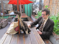 Matt Timms with the station’s stray cat, after an episode of Let’s Eat In