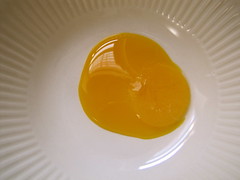 We start with the basics: some good baking chocolate (I used 72% Green & Black’s Organic), and butter. It gets melted over indirect heat (read: placed in a bowl set over a boiling pot of water), and the only tricky part is next whisking in a single egg yolk (for a batch of about thirty truffles). No sugar. Next, we chill the stuff until it’s solid, and bring it out of the fridge to let it soften for twenty minutes.