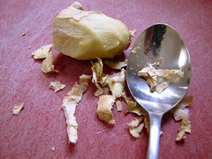 peeling fresh ginger with the edge of a spoon (it saves more flesh than with a knife)