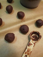Okay, the next part is a little tricky, too: you’ve got to scoop the mixture, which is almost as pliable as Play-Dough, with a melon baller and roll it quickly between your palms to enforce the sphere — but work fast or your hands will melt it! Now it’s easy riding: plop them immediately into a bowl of cocoa powder and chill. That would be it, all ready to eat at this point, except I didn’t coat mine in cocoa. (Okay, and I also didn’t use a melon baller for lack of that nifty gadget, but a round teaspoon sufficed just fine.)