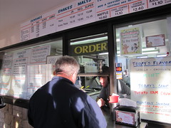 It was a new sensation, like the rest of the place. Dribbling just a little onto the cone in the few seconds in which it had been passed to me, the custard was silken and soft in the most lickable way. (You know when you make a lick for a hard scoop of ice cream, and don’t lap much up? This would never happen here.) Its texture was complemented by whole — not chopped — pecans that were perfectly roasted and very lightly salted, and they were supernaturally crisp for being submerged in the creaminess. I’m usually wary of the flavor butter pecan for ice cream, because short of studding it with the nuts, there’s no way to get the flavor of buttery caramel-coated pecans steeped into the cream. So it’s “natural” flavoring all the way. Here, the flavor was mild, and obstructed in the most delightful way with the actual pecans. The chocolate malt flavor in the bottom scoop was equally appealing, though less showy. By my last bite of cone, I knew I was dealing with something seriously deep-rooted and religious here. I shied away toward the exit and backed out the door, holding my malt and burger bag hostage.