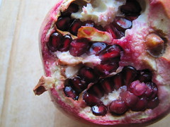 I also mentioned a story in the Times called the 11 Best Things You Aren’t Eating, when we were talking about rutabaga. Turns out rutabaga was not on that list, I was mistaken, but pomegranate juice was, and it was true that I wasn’t eating (or drinking) it. Pomegranates are not local, and once broken open, they kind of look like they came from another planet. But as the story said, they’re full of antioxidants, and may lower blood pressure.