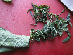 I was also inspired to serve them fresh by Stacey Murphy, of BK Farmyards. When she came on Let’s Eat In last week with Liza de Guia, she spoke of making a pesto with fresh, pulverized kale instead of herbs. I’ll have to try that still, but in the meantime, I rolled up a few leaves and chopped them into stringlike chiffonades for this salad.