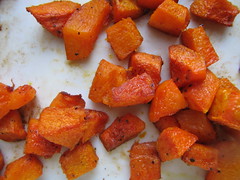 butternut squash cubes before roasting, in olive oil, salt and pepper