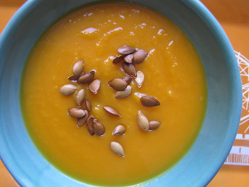 So we concentrate the butternut squash, first by roasting it for quite long, until sticky and caramelized at the surface. Then, to smooth out its consistency so that it’s not plain butternut mash but a lappable soup, let’s add the concentrated juices of other vegetables we love, too, in liquid form (aka vegetable stock), and to heighten its natural sweetness, just a touch of local bees’ honey. And that’s all this soup really is. A concentrated blend of your favorite juices (not unlike the stuff in a can you helped your mom to “make” orange juice out of as a kid — that might be a fun project, though, making condensed cans of frozen squash soup), and honey. And, some crisped seeds from the squash itself — it’s amazing how one squash produces just about as many seeds to flesh as you’ll need to garnish a soupful of it (and now, if only there were some good uses for its rather unpalatable, leathery skin).