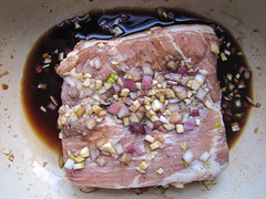 marinating pork belly in soy sauce and rice vinegar for a Sunday potluck