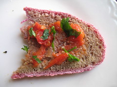 an experiment involving beet juice and no-knead bread, with fresh tomato sauce and parsley