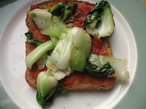 garlic-sauteed broccoli with leftover tomato sauce on wheat toast …