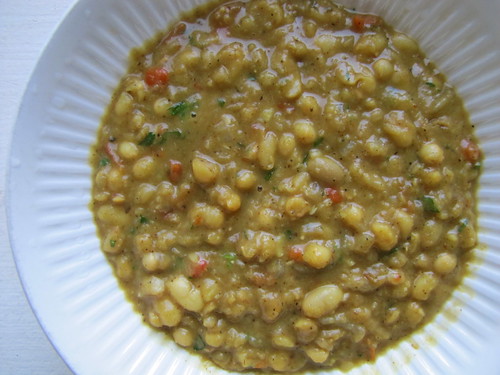 Darn good? I’ll let you decide. But when I told some friends that I was making dal for them, they all heaved with individual thoughts of relish for the dish. Commonly made with lentils both red, green or a tannish in-between, it’s a mainstay of the pedestrian diet throughout South Asia — as well as to that of a growing faction of simple food-loving vegetarians in this one, such as my friends. None had ever seen it without lentils, and until recently, I had assumed this was essential to dal-making, too. Yet Wikipedia cites several traditional versions made with other legumes: chickpeas in chana daal, pigeon peas in toor dal, or kidney beans for rajma dal. In fact, the word dal simply refers to the processing of the bean, “to split.” So the swapping of little white beans doesn’t seem to be much of a departure in this version. I just wish I knew Sanskrit so as to give mine a better name.