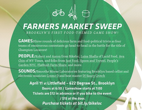 The Farmers’ Market Sweep is April 11th — come down to cheer on these contestants in a food-politics trivia! Louisa Shafia, Just Food staff, and more will go head-to-head on their food-movement know-how at this live music-filled party. (Goodness knows I would have loved to be there with everyone if that date didn’t find me in Boston for a sustainable expo, D2E. D’oh!) In any case, you can learn more about the upcoming bike tour from Aaron and Robert yourself then, and you can also VOTE now to help get it off the ground at their Pepsi Refresh fundraising page. Voting ends March 31, and their proposal will need to stay among the top ten most-voted to get funding.