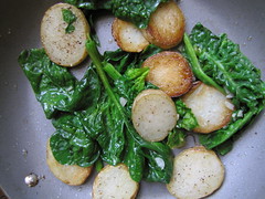 potatoes are sliced for a quick crisp on a pan; spinach is tossed in at the end