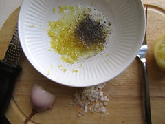 The “cracked pepper vinaigrette” sounded pretty simple, so I worked on that while the squid — and the roasted potatoes — cooled. Instead of preserved lemon, I went with regular, fresh lemon, because that’s just the most readily available to the home cook. You can certainly make them at home if you have the time, and the Meyer lemons, which are more authentic to this Moroccan cooking staple. But fresh lemon juice and zest sounded like a good enough complement to this seafood salad to me. So I grated about half a lemon’s worth of zest and squeezed its juice into a bowl, and whisked that with olive oil, lots of coarse black pepper, chopped shallots, and a pinch of salt. Now it was time to toss.
