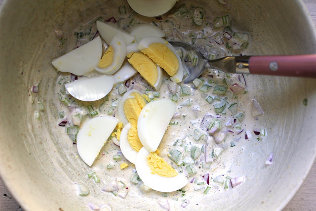 I wonder why egg salad hasn’t had a dramatic revival in recent years. With the re-embrace of eggs from a health perspective (not to mention its being an eggcelent protein for economy’s sake), it seems eggs can do no harm poached, fried, or hard-boiled on even the finest restaurant plates. But egg salad? Perhaps the pale-yellow deli standard could use a little perk.