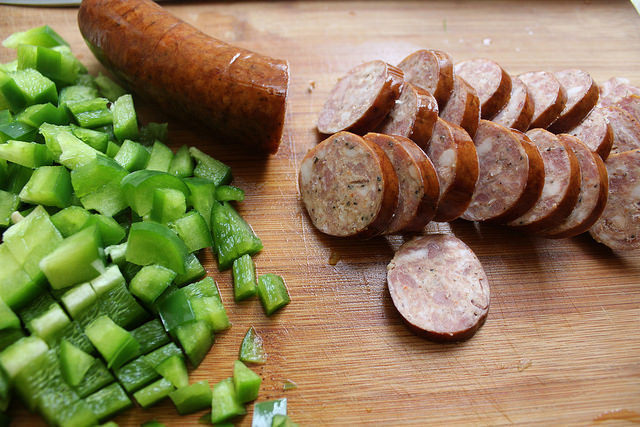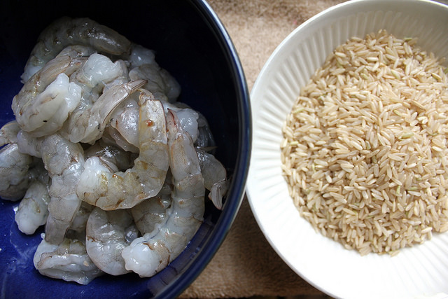 Four brownie points: Rice, shrimp, bell peppers… these are things we don’t have in the winter months of the Northeast. This dish is a vacation to a warmer place on your plate, and to source the ingredients, I got frozen shrimp (farmed, see more on shrimp choices here), canned tomatoes, and that delicious Andouille sausage which is actually not hard to get from sustainable meat purveyors all year ‘round.