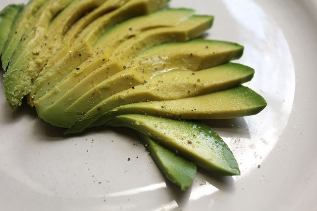 Arrange the thinly sliced halves of avocado on two separate plates in a fan. Sprinkle with salt, pepper, and a squeeze each from the lemon.
