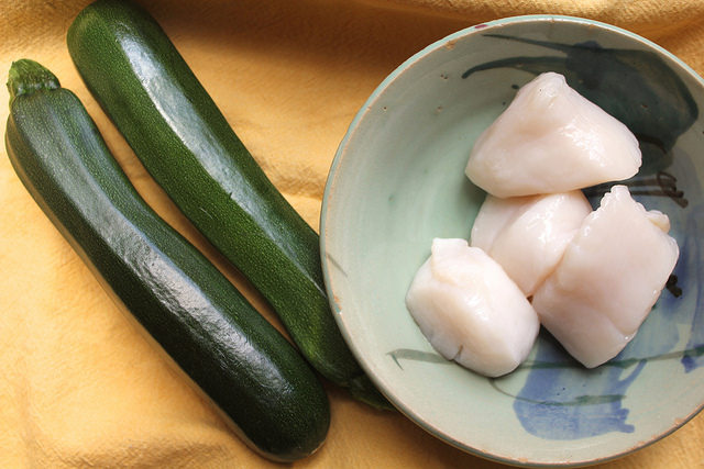 For less of a splurge when scallops aren’t on sale, this would probably work really well with firm-fleshed fish cut in cubes. I’m thinking black cod? Unless you cut it in rounds you’d lose the visual balance with the zucchini, but it should still be an attractive presentation.