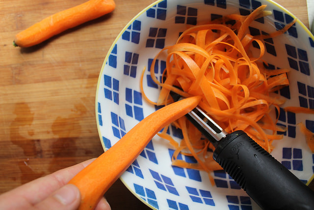 I also made a carrot-lime slaw using shavings of the carrot from a regular vegetable peeler, and I roasted juicy slabs of broccoli (halved lengthwise from a whole crown) along with the chicken leg quarter to go with it. It ended up looking like a sloppy pile of What? but it was very tasty all together, with refreshing and savory components complementing one another.