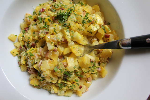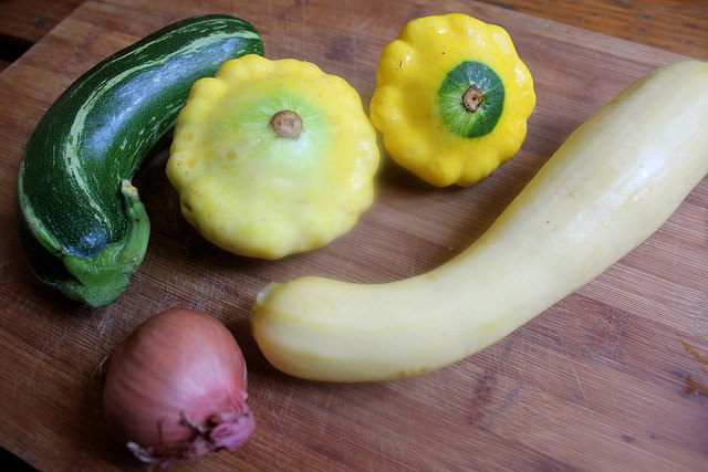 So I’m going to go with summer squash risotto, because even though it does not have rice in it, the preparation is easily recognized: you soften some onions, maybe a bit of pork scraps, add the main substance and deglaze with wine and stock until it reaches a creamy consistency, but that substance still retains some of its bite. That substance in this case is summer squash.