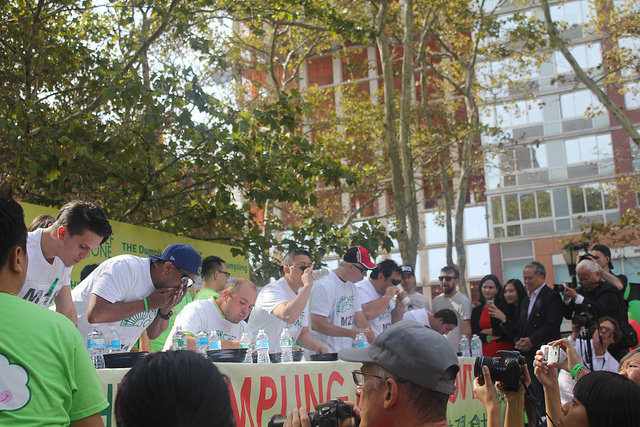 New York, I still love you. I think that’s how many people felt when they saw the infamous pizza rat meme. For all the crap that goes through its gutters each day, all the crazies and critters that line its streets, there is a gleeful levity in little moments like these happening in every corner of the city all the time. And so for all the hunger that some of its people suffer, there are events like the NYC Dumpling Festival, pelting food from all whichways at patrons whose admission tickets would benefit the Food Bank for NYC. And in one of its biggest public attractions, going twelve years strong: a dumpling eating contest waged by amateur overeaters.
