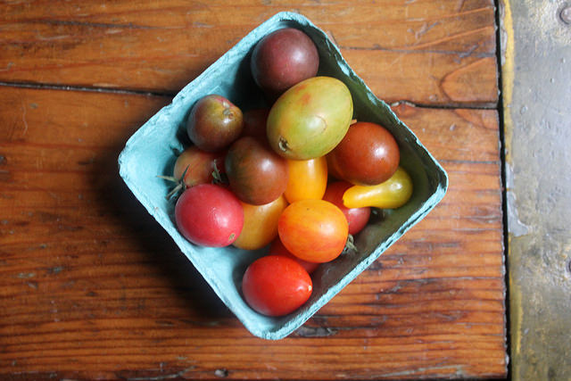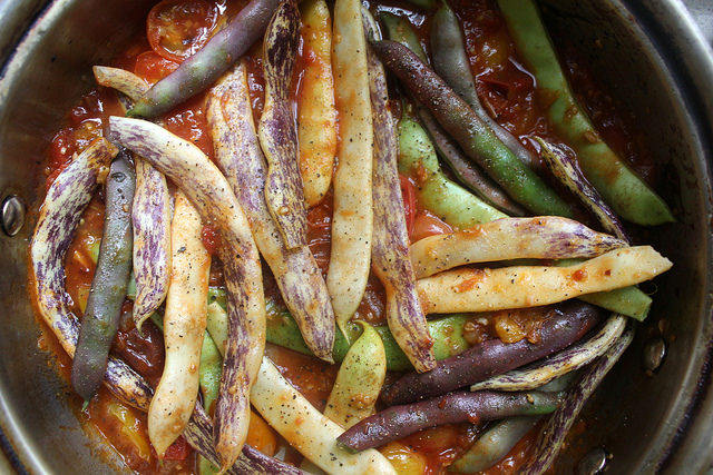 It’s also a good season to get back to slow-braising and simmering things on the stove. It dropped about twenty degrees over the weekend, but I’ve still got some summer produce from previous weeks’ CSA shares. I was aware of an oldschool Italian way of simmering green beans very slowly in a tomatoey braise, a homestyle tradition learnt through old cookbooks and the occasional mention here and there.