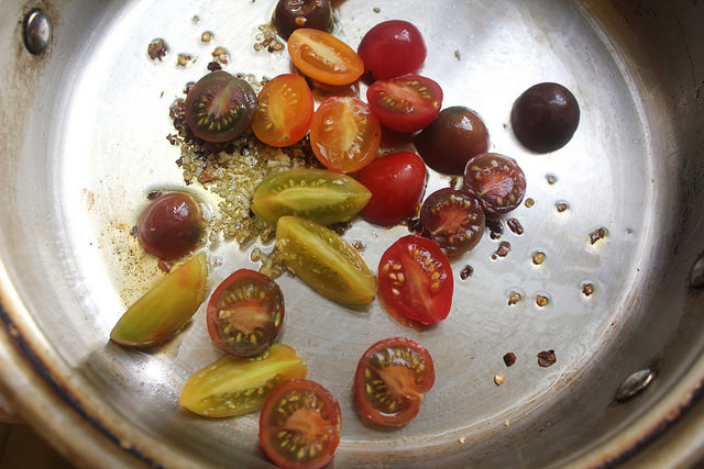 I began by sauteeing something. I wasn’t sure what. Little heirloom cherry tomatoes and garlic seemed a good start to whatever it was.