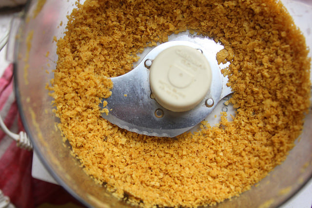 Place the Doritos in a food processor or blender and pulse several times until a coarse meal-like texture.