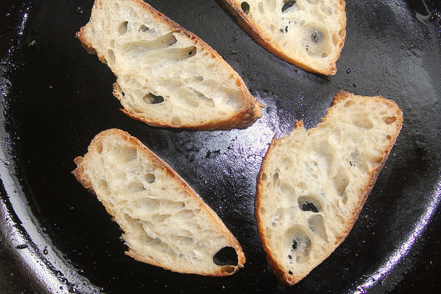 Coat the bread slices with one tablespoon of olive oil and toast either by placing on a baking sheet and baking at 350 degrees for about 5 minutes, or by heating in a heavy-bottomed pan such as cast-iron. Let cool a few minutes.