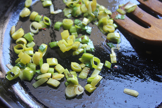Meanwhile, heat one tablespoon of the butter or oil over low heat and add the leeks, along with a pinch of red chili flakes, salt and pepper. Cook on low heat, stirring occasionally, until softened and just a little crisp, about 5 minutes. Remove from pan and wipe down any bits.