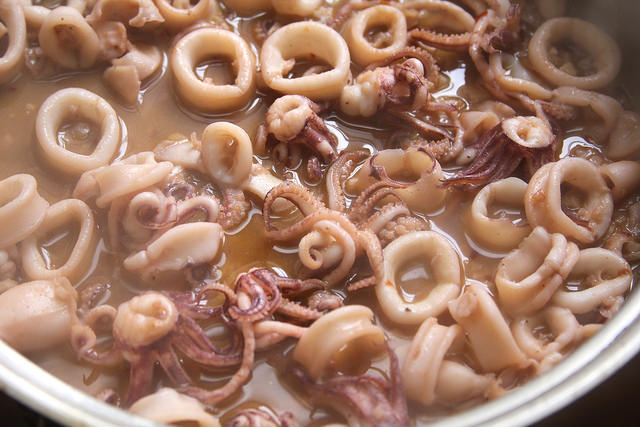 Separate the tentacles from the squid and slice the bodies into about 1/2″ rings. Set aside.